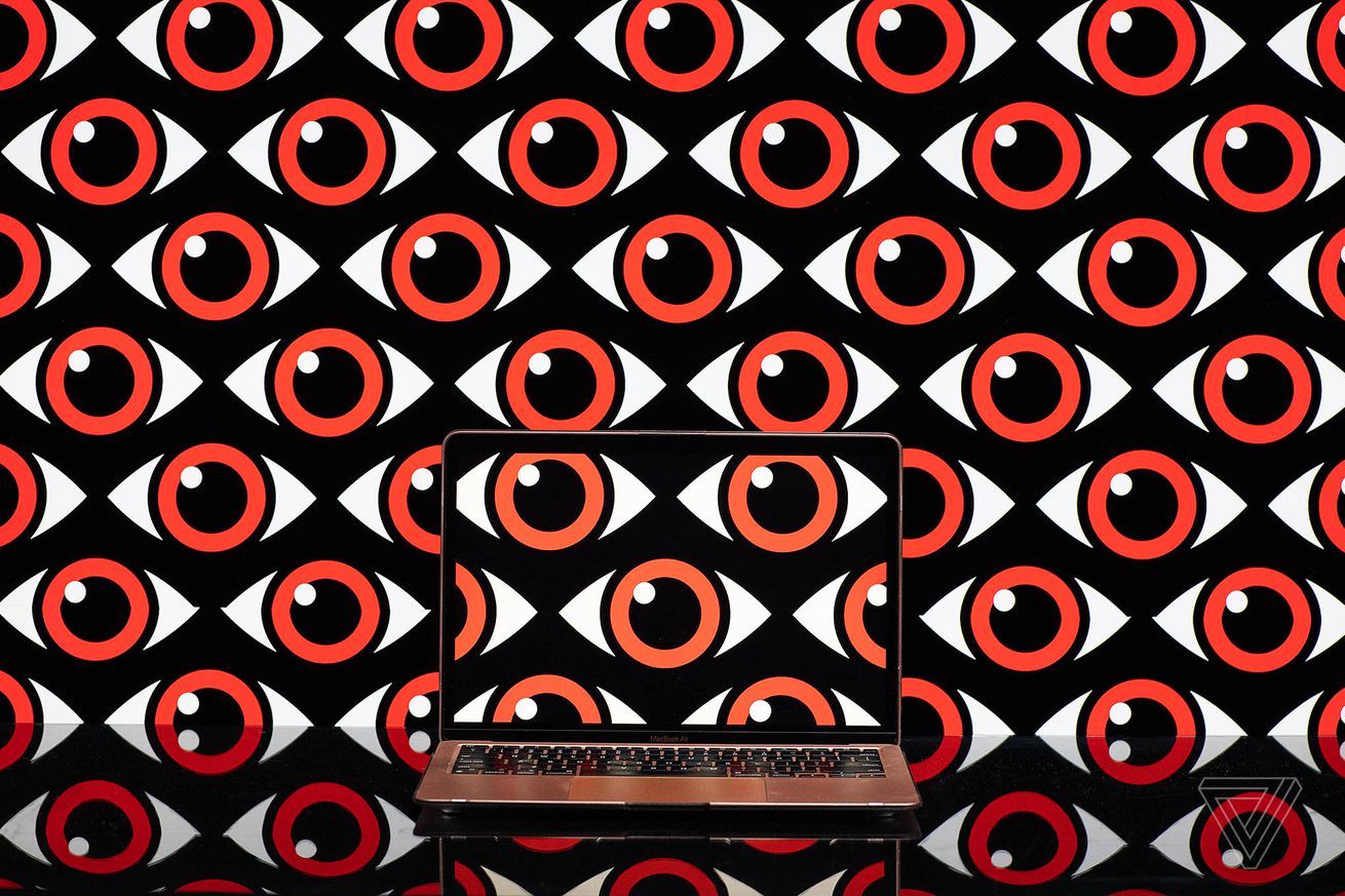 Art rendering of transparent laptop in front of a wall of surveilling eyes.