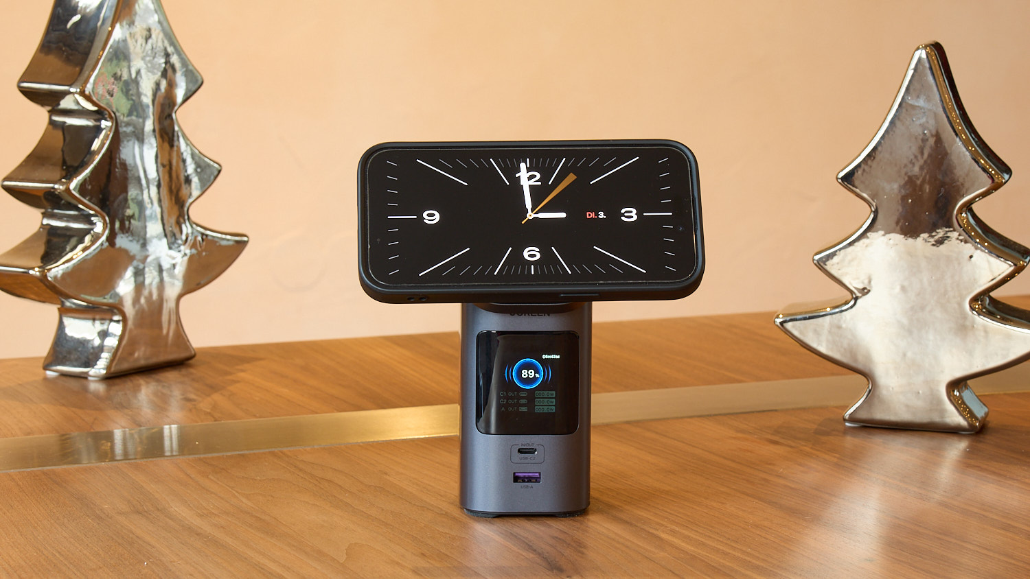 One of the coolest things about this Ugreen model is that it even has a magnetic wireless charger pad at the very top that delivers 15W power, which is perfect for iPhones. The pad tilts so you can still access your phone while charging. There are two charging ports on the front of the power bank—one type-C and one type-A— placed just below the display showing each port’s charging speed. There’s another type-C port on the back, which you can also use to recharge the power bank.