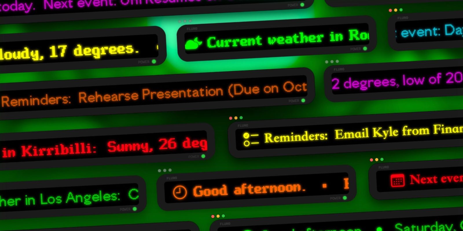 Fluro provides a delightful recap of everything you’d need to know in a day, all in a neat Mac interface with a special LED scroller. It delivers the weather, your calendar events, reminders, the news, and more – all with a pinch of nostalgia.